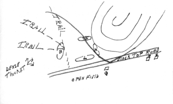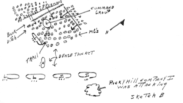 | The machine gun firing and hand grenade throwing from behind the hill thereupon ceased. Pfc Wagner returned to his platoon and grabbed a prisoner whom someone in the meantime had captured, held the prisoner across his chest to cover him from enemy fire and ordered the prisoner in what little German he knew to call out to his comrades behind the hill and order them to surrender. He walked around the hill and eight Germans, three of who were wounded surrendered to him. Nine other dead Germans were also found. Company I by use of this rocky hill now had an observation post from which they could see for the first time for some distance in every direction and could see plainly the fields to the south of the forest. At this time Company L had also run into heavy machine gun fire and hand grenades, and was viciously engaged at close range with determined enemy. 1st Lt. George M. Bird was wounded at this time when he went forward alone and killed two Germans and routed several others who were holding up the advance of Company L. In spite of his leg wound he reorganized his company under fire, and ordered it to continue its advance before he was evacuated. At approximately 1600 or about 10 minutes after Lt. Bird had been evacuated and also at approximately the same time Company I was seizing the small rocky hill, Lt. Col. Bealke and his command group, which were abut 100 yards behind the left platoon of Company L, at Point B (Sketch A) were viciously attacked by an estimated squad of Germans, who came from the west through the thicket behind the assault platoon of Company L and threw hand grenades and fired machine guns at the command group. The enemy were beaten off by small arms fire of the command group and a small platoon of Company L which had come down through the thicket and run into the command group, when suddenly the Germans attacked the command group again from the west side and the rear this time with what much have been a rifle platoon. (See sketch)