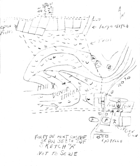 For approximately three days, the 8th, 9th, and 10th of July 1944, the 90th Infantry Division was engaged in The Battle of the Foret De Mont Castre and did not succeed in penetrating the forest. During the battle, Third Battalion, 359th Infantry, was on the right flank of the Third Battalion, 358th Infantry and the Second Battalion, 359th Infantry, was attached over to the 358th Infantry and was on the left flank of the Third Battalion, 358th Infantry. On the afternoon of 10 July 1944, The Third Battalion, 358th Infantry which was occupying a defensive position of the northern edge of the Foret De Mont Castre (See overlay #1), was ordered to attack at 1400 to the south-west of its sector. The strength of the Battalion at the start of this battle was as follows: